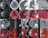 本例患者首先进行了胸腹部CT及腹部MRI检查,2种检查均诊断肝脏及双肾错构瘤,CT发现多发薄壁囊性病变,未做定性诊断。CT空间分辨率及密度分辨率高,显示病灶形态、分界较为清晰,能准确显示肺内弥漫囊性病变、肝脏及双肾内脂肪和软组织成分,但CT软组织分辨力不及MRI。MRI进一步明确肝脏及肾脏的错构瘤中各种组织成分,但扫描时间长,对肺部疾病的诊断价值受限。PET/CT通常行全身显像,能显示病灶的代谢和解剖信息,本例中,其在发现全身病灶、提示TSC诊断及其伴发感染中有着重要的价值。