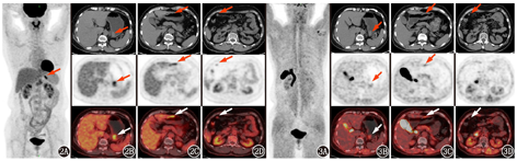 近年来,以成纤维细胞激活蛋白(fibroblast activation protein, FAP)为靶点的FAPI PET/CT显像已成为临床显像热点[4]。FAP在肿瘤相关成纤维细胞中高表达,而在正常组织中几乎不表达,是恶性肿瘤诊疗良好的新靶点。FAPI是靶向FAP的小分子化合物,68Ga、18F、64Cu等正电子核素均可标记FAPI作为PET/CT的新型显像剂,其中目前研究最多的是68Ga-FAPI。18F-FAPI与68Ga-FAPI显像特征类似,由于18F可由回旋加速器批量生产,因此18F-FAPI更适合大流通量的单位。68Ga-FAPI可在多种实体肿瘤中呈高摄取[5],一项纳入17例临床研究的meta分析显示,68Ga-FAPI对于不适合18F-FDG显像的肿瘤具有重要临床价值,对腹部恶性肿瘤的原发灶及转移灶的检测明显优于18F-FDG[6]。