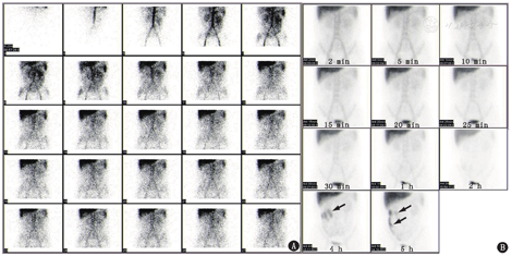 明确诊断PLE的必要条件是证实蛋白质从胃肠道丢失。蛋白质从胃肠道丢失的病理机制主要有3种:(1)胃肠道黏膜损伤,可以导致富含蛋白质的体液渗出;(2)炎性反应、浸润性和遗传性疾病使胃肠道的黏膜通透性增加,可导致蛋白质漏入肠腔内;(3)淋巴管阻塞、淋巴系统先天性异常或中心静脉压升高的疾病可导致淋巴管压力升高,从而使淋巴液从肠道丢失。为进一步明确PLE的诊断及鉴别蛋白质丢失的机制,患者行99Tcm-人血清白蛋白(human serum albumin, HSA)肠道蛋白丢失显像(图1)和99Tcm-硫化锑(antimony sulfide, ASC)淋巴显像(图2)。99Tcm-HSA肠道蛋白丢失显像中,血流期可见腹部显像剂摄取增高,以中上腹部为著,提示可能是腹部肠管血流灌注增加所致;之后的各期延迟显像见4 h(相当于第4组小肠部位)有异常放射性增高区,随时间延长放射性增高区逐渐移行,至5 h见升结肠显影。这个检查证实了肠道蛋白丢失,并且丢失的部位很可能位于第4组小肠。99Tcm-ASC下肢淋巴显像可见双下肢淋巴管显影清晰,回流通畅,腘窝、腹股沟、髂及腰干淋巴结显影清晰,各期显像腹部始终未见异常放射性增高区,因此排除了淋巴系统异常、淋巴液丢失所致的PLE。