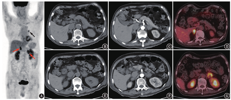 患者男,73岁,2021年6月开始自觉肤色加深,无其他不适,未诊治。2021年8月因外伤于外院查腹部平扫CT发现双侧肾上腺不规则肿物,左侧为著。后就诊于本院,血促肾上腺皮质激素(adrenocorticotropic hormone, ACTH)>1 250(正常参考值范围,下同:0~46) ng/L,皮质醇35.9(110.5~616.3) nmol/L。腹部增强CT及18F-FDG PET/CT显像(图1)提示右侧肾上腺弥漫增粗,增强后呈轻度均匀强化,代谢明显增高,SUVmax 7.0;左侧肾上腺见类圆形团块,大小约3.3 cm×3.7 cm,呈轻度不均匀强化,代谢呈不均匀增高,SUVmax 5.6,中心见代谢减低的囊变坏死区;此外,左肺门见一代谢轻度增高的小结节,大小约1.2 cm×1.6 cm,SUVmax 3.8,考虑可能为炎性淋巴结。