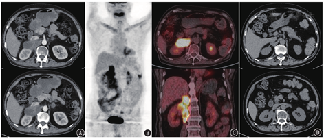 原发性肾上腺皮质功能减退可由自身免疫性疾病、感染性疾病(结核杆菌感染、真菌感染等)、转移瘤或淋巴瘤代替正常肾上腺组织、肾上腺出血/梗死或药物等原因引起[1,2],在我国最常见的原因为结核感染[3]。与结核感染相关的肾上腺皮质功能减退最常发生于老年男性。结核感染所致的肾上腺破坏通常呈渐进性,在病变早期,双侧肾上腺弥漫性增大,进展期形成低密度或软组织结节、肿块,密度均匀并代谢增高(图2),其病理组织学对应结核的上皮样细胞及多核巨细胞形成肉芽肿性炎,如果病灶内发生干酪样坏死,PET/CT显像则表现为肾上腺代谢增高区内伴局部代谢减低区,对应平扫/增强CT表现为低密度无强化区[4]。本例患者的影像学表现完全符合结核的特点及相应病理阶段,即炎性肉芽肿浸润的同时伴有中心干酪样坏死。肾上腺转移瘤可为单侧,也可为双侧,影像上通常表现为低密度或软组织密度结节、团块或肿块[5],代谢程度与原发灶程度相当(图3),转移瘤较大时病变中心会出现坏死。本例患者的PET/CT未发现全身其他部位原发肿瘤病灶,所以可除外肾上腺转移瘤。累及肾上腺的淋巴瘤多为侵袭性淋巴瘤,一般表现为肾上腺代谢明显增高的肿物(图4),病变一般比本例更大、代谢更高、囊变坏死更少[3,5],并且肾上腺外可见淋巴瘤病灶,所以本例暂不考虑淋巴瘤。另外,从肾上腺皮质功能减退的发生机制来看,由于肾上腺皮质具有很强的代偿能力,在出现肾上腺功能减退之前大多数的肾上腺皮质已被破坏。转移瘤和淋巴瘤都是肿瘤组织取代正常的肾上腺组织,只有当肿瘤较大、病变较晚期时才会出现肾上腺皮质功能减退;而结核等感染性病变对正常肾上腺组织的破坏力更强,更容易发生肾上腺皮质功能减退。所以从影像和临床综合来看,本例最有可能的诊断是肾上腺结核。