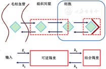 为了便于说明,将二室模型的差分方程与一室模型方程进行比较。可逆隔室现在有2个输入源(由K1描述的血浆传输,由k4描述的结合隔室流出)和2条流出路径(到血浆,由k2描述;到捕获或结合的隔室,由k3描述),得出以下二室模型可逆室差分方程: