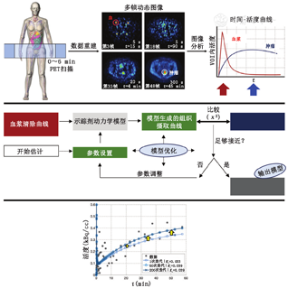 1.概述。图2说明了动态PET显像(上)和动力学建模及分析(中)的概念框架。与标准临床显像的1个重要区别是,动态显像需要随时间收集动态体积的四维(3个空间维度和时间)显像数据。扫描期间获得的患者关键数据包括测量随时间变化的靶组织摄取曲线(时间-活度曲线),以及示踪物从血浆中清除的数据。靶组织摄取曲线可通过直接动态显像获得,而血浆清除曲线可通过血液采样、图像分析或这2种方法的结合来测量[8]。