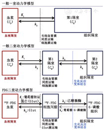 图3说明了最常用于PET肿瘤放射性示踪剂的一室和二室模型(上,中)以及18F-FDG动力学模型作为二室模型的具体实现。血浆输入曲线作为模型的驱动函数,按惯例不算作1个隔室,但在药理学等其他领域,血液或血浆清除曲线是动力学分析的1个重点,并作为1个隔室被包括在内[27]。