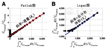 最常用的放射性示踪剂显像方法通常被称为图形分析,其利用大多数临床相关PET示踪剂在靶组织中分布相当迅速,并在注射后20~40 min进入血浆清除期的事实。这种快速分布导致伪稳态,即使血液和组织曲线随时间变化,组织示踪剂摄取动力学在很大程度上是由代谢的速率限制步骤驱动的,而不是由运输和早期组织分布驱动的。使用图3所示的二室模型可以理解这一过程。注射后早期,当血浆时间-活度曲线快速上升和早期下降时,靶组织将在第1个可逆隔室中与血液大量交换示踪剂,反映示踪剂的早期输送。一旦这一过渡期过去,血浆清除曲线趋于更稳定——通常是指数清除,可逆室就会与血液达到伪平衡。然后,示踪剂摄取反映了稳态示踪剂进入第2个隔室的运动——被捕获的代谢产物或可逆的靶结合过程。Patlak和Logan[59,60]的开创性研究表明,这些条件导致了时变组织-血液摄取比和血浆示踪剂可用性测量之间的后期线性关系,可以在示踪剂注射后的某个时间,通过简单的线性拟合(图6)来进行通量(Ki,Patlak分析)或VT(Logan分析)估计。虽然图形方法不需要基础模型,但靶组织中示踪剂药理学和动力学的知识是确保满足所选图形方法假设的关键。