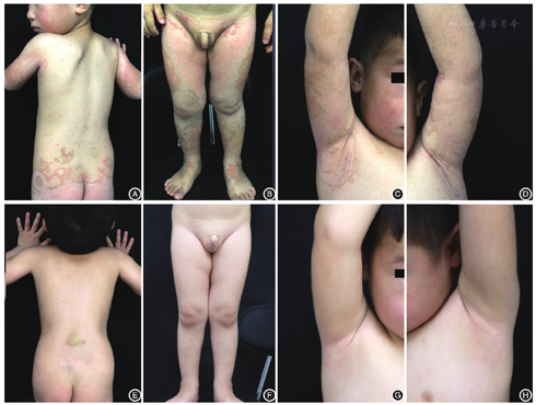 A 3-year-old male child presented to the Hospital for Skin Diseases with generalized, irregularly-shaped, erythematous, scaly patches and hyperkeratotic plaques located on the lower abdomen, inguinal fossa, buttocks, limbs, axillae, and face (Figure 1A-D) since his neonatal age. These erythematous lesions were observed to change in shape and position over time. The lesions were asymptomatic and became worse in summer, while no palmoplantar keratoderma was observed.