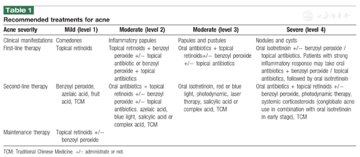 | Second-line therapy | Benzoyl peroxide, azelaic acid, fruit acid, TCM | Oral antibiotics + topical retinoids +/- benzoyl peroxide +/- topical antibiotics, azelaic acid, blue light, salicylic acid or complex acid, TCM | Oral isotretinoin, red or blue light, photodynamic, laser therapy, salicylic acid or complex acid, TCM | Oral antibiotics + topical retinoids +/- benzoyl peroxide, photodynamic therapy, systemic corticosteroids (conglobate acne use in combination with oral isotretinoin in early stage), TCM |