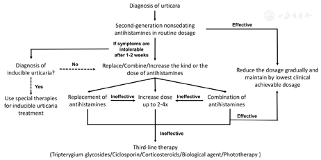 Second-line therapy: As the curative effect varies among different individuals and urticaria types, antihistamine replacement or combination may enhance the treatment efficacy if the urticaria symptoms do not improve after one to two weeks of treatment with second-generation antihistamines at routine dosages. Taking a combination of second- and first-generation antihistamines at bedtime improves sleep. In addition, certain patients may benefit from a two- to fourfold increase in the dose of secondgeneration antihistamines, with informed consent.