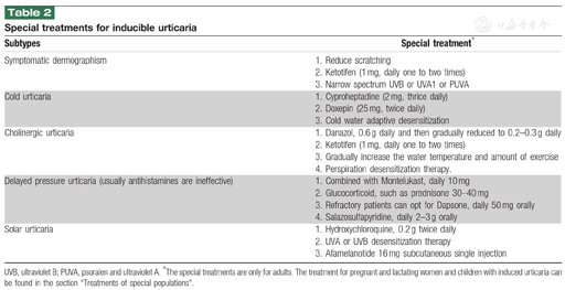 UVB, ultraviolet B; PUVA, psoralen and ultraviolet A. The special treatments are only for adults. The treatment for pregnant and lactating women and children with induced urticaria can be found in the section "Treatments of special populations" .