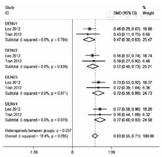 共有2篇文献报道了全程接种CYD-TDV的成人28 d后的免疫原性结果,经异质性检验,I2=18.4%,P>0.05,故采用固定效应模型。试验组和对照组间中和抗体GMT的SMD为0.63(95%CI:0.55~0.71)。针对DENV1的中和抗体GMT的SMD为0.47(95% CI:0.30~0.63),针对DENV2的SMD为0.57(95% CI:0.40~0.73),针对DENV3的SMD为0.72(95% CI:0.56~0.89),针对DENV4的SMD为0.77(95%CI:0.60~0.93)。见图2。