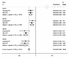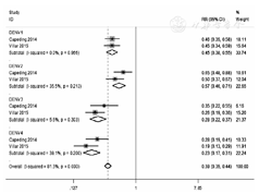共有2篇文献报道了全程接种CYD-TDV后VE的意向性分析结果,经异质性检验,I2=81.3%,P<0.01,故采用随机效应模型。试验组和对照组间登革热发病率的RR为0.39(95%CI:0.35~0.44),VE为61%(95% CI:56%~65%)。针对DENV1的RR为0.45(95%CI:0.38~0.55),VE为55%(95%CI:45%~62%);针对DENV2的RR为0.57(95% CI:0.46~0.71),VE为43%(95%CI:29%~54%);针对DENV3的RR为0.28(95%CI:0.22~0.37),VE为72%(95% CI:63%~78%);针对DENV4的RR为0.23(95%CI:0.17~0.31),VE为77%(95%CI:69%~83%)。见图4。