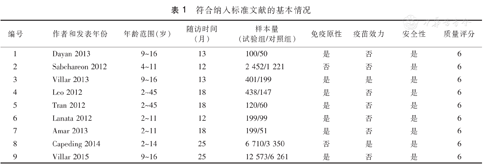 9篇文献中除2篇研究对象涉及18岁以上成人,其余7篇文献研究对象均为18岁以下儿童和青少年。所有纳入文献的随访时间均超过1年,其中有2篇随访时间达到25个月。有7篇文献报告了接种CYD-TDV后免疫原性结果,2篇文献报告了接种CYD-TDV后VE结果,所有文献均报告了接种CYD-TDV后疫苗安全性结果。纳入的9篇文献质量评分为6分,均属高质量文献,详见表1。