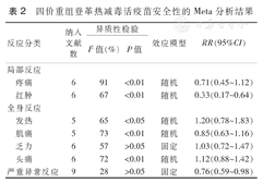 共有6篇文献报道了试验组和对照组间局部反应发生率的差异,其中红肿的发生率组间差异有统计学意义(P<0.01)。严重异常反应的发生率组间差异有统计学意义(P<0.05),详见表2。