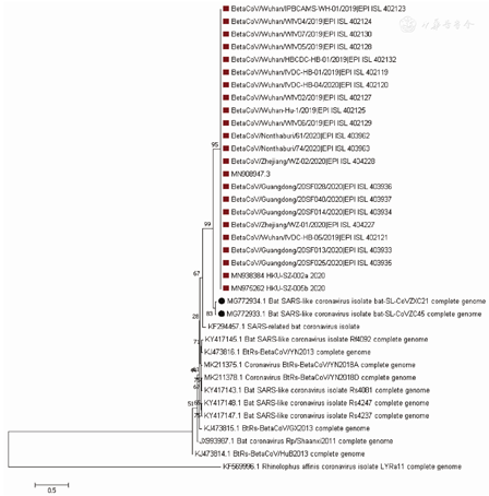 目前,学界认为可能是一种携带SARS-CoV-2的动物将病毒传播给了人类[2]。2020年1月22日,中国的一个研究小组称蛇是本次病毒传播的罪魁祸首[3]。但许多科学家质疑这种说法,表示并没有证据表明病毒可以感染哺乳动物和鸟类以外的其他物种。Callaway和Cyranosk[4]综合了多位学者的意见,认为蛇可能不是SARS-CoV-2的中间宿主。武汉病毒研究所的科学家团队发现SARS-CoV-2与一种蝙蝠中的冠状病毒序列一致性高达96.2%[5]。Wu等[6]研究了来自武汉的7例患者,收集了患者支气管肺泡灌洗液,利用测序技术鉴定出了SARS-CoV-2。病毒全基因组分析显示,该病毒与SARS冠状病毒接近(89.1%的核苷酸相似性),SARS冠状病毒来自蝙蝠并有基因重组历史。Robertson[7]对SARS-CoV-2 Wuhan-Hu-1株全基因组序列进行进化分析,认为SARS-CoV-2与乙型冠状病毒属中的蝙蝠冠状病毒关系最为密切,并且其系统发育聚类始终是SARS相关蝙蝠冠状病毒的姊妹群。来自9例患者的10个SARS-CoV-2基因组序列同源性达99.98%以上,与2018年SARS相关冠状病毒bat-SL-CoVZC45和bat-SL-CoVZXC21密切相关,因此蝙蝠或为SARS-CoV-2潜在的起源[5]。此外,北京大学和浙江大学使用深度学习算法预测武汉SARS-CoV-2的宿主及传染性,结果表明蝙蝠和水貂可能是SARS-CoV-2的两个来源,中间宿主可能为水貂[8]。