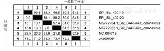 以BetaCoV/Wuhan/IVDC-HB-01和BetaCoV/Wuhan/IVDC-HB-04为代表株,分析与SARS冠状病毒(NC_004718)、中东呼吸综合征(MERS)冠状病毒Human betacoronavirus 2c EMC/2012 (JX869059)及SARS相关冠状病毒bat-SL-CoV-ZC45和bat-SL-CoVZXC21核苷酸同源性,结果与SARS冠状病毒同源性达80.0%~80.3%,与MERS冠状病毒同源性达53.5%~53.6%,与SARS-CoV-2进化关系最近的SARS相关冠状病毒bat-SL-CoVZXC21和bat-SL-CoVZC45核苷酸同源性达88.1%~88.5%(图3),SARS-CoV-2 BetaCoV/Wuhan/IVDC-HB-01与bat-SL-CoVZXC21株非常相似(图4),与现有发表的观点一致[1,5]。