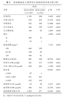 高尿酸血症人群肾结石患病的单因素分析(例)
