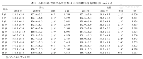 不同年龄、性别中小学生2014年与2010年身高的比较(cm,