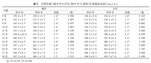 无论男性还是女性,城市还是乡村,2014年合肥地区各年龄组中小学生的身高普遍高于2010年[1]。见表1,表2。