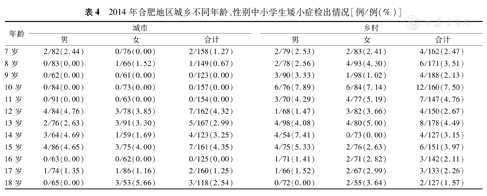2014年合肥地区城乡不同年龄、性别中小学生矮小症检出情况[例/例(%)]