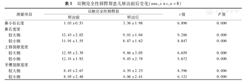 双侧完全性唇腭裂患儿矫治前后变化(mm,