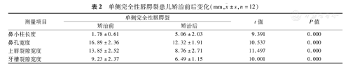 单侧完全性唇腭裂患儿矫治前后变化(mm,