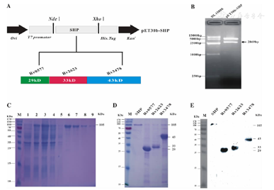 (A),(B):重组质粒pET30b-SHP构建和酶切鉴定(C)-(E): SHP及其亚组分蛋白的表达、纯化和Western blotting鉴定