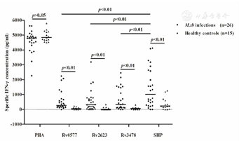 非特异性刺激物PHA诱导M.tb感染者(26例)和健康对照者(15例)外周血淋巴细胞产生的IFN-γ水平差异无统计学意义(t=1.694,P>0.01);SHP及其亚组分蛋白特异性诱导M.tb感染者外周血淋巴细胞产生的IFN-γ水平均显著高于健康对照者(t=3.062,P<0.01),且SHP刺激M.tb感染者外周血淋巴细胞产生的IFN-γ水平较亚组分蛋白刺激水平显著升高[如SHP刺激值分别为(1 420.0±253.9)pg/mL和(236.1±95.1)pg/mL,t=2.063,P<0.01]。见图2。