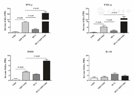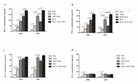 肺脏组织IFN-γ、TNF-α、iNOS表达水平检测中,TMD组和BCG+SHP/TMD组均为表达水平最低和最高者,其中SHP/TMD组表达IFN-γ和TNF-α水平均显著高于BCG组(F=259.7、113.7和101.1,均P<0.05)。各组表达的IL-10水平均较低且差异无统计学意义(F=9.667,P>0.05)。见图5。