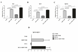 TMD组无显著的特异性IgG抗体及其亚类产生,BCG+SHP/TMD组产生的特异性相关抗体滴度显著高于SHP/TMD组,且均高于BCG组(F=635.6、471.2和628.5,均P<0.05);SHP/TMD组和BCG+SHP/TMD组IgG2a/IgG1比值亦显著高于TMD组和BCG组(F=46.78,P<0.05),提示此亚单位疫苗可诱导强烈的Th1型免疫应答。见图4。