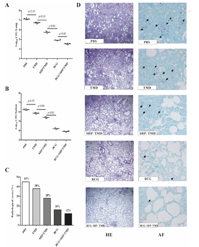 无论肺、脾脏菌落计数中,PBS组荷菌量均最高,SHP/TMD组相对于TMD组显著降低了荷菌量[如在肺脏中SHP/TMD组和TMD组分别为(5.73±0.22)和(6.78±0.17),F=151.8和109.9,均P<0.05],但保护性不及BCG组;而BCG+SHP/TMD组均提供了最强的保护性。HE染色、抗酸染色(AF)和病理评分结果与菌落计数结果相符合:即PBS组显示最严重的肺部病理改变(如广泛纤维化、血管周围炎和肺泡炎)、最高的病理评分以及聚集成团的抗酸杆菌;SHP/TMD组肺部炎症减轻且抗酸杆菌减少;BCG+SHP/TMD组肺泡组织AFB最少、肺部炎症局限化且病理评分最低。见图6。