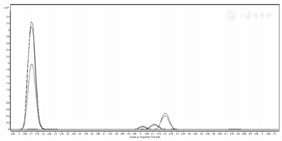 质谱检测采用Agilent 6495,离子源类型为ESI,采用正离子模式进行检测。离子源温度为250 ℃。同时监测:DHEA(304.1→253.1),DHEA-S(384.2→286.2),A-dione(317→124),T(304.1→124),DHT(306.1→81),Androsterone(306.3→255.1)。碰撞电压(collision energy,CE)等条件进行了系统优化,以便达到最佳的稳定性和灵敏度。