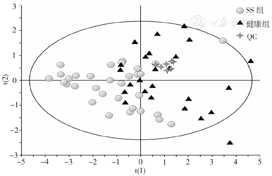 从PCA得分图上,QC样本点分布集中,表明分析数据具有良好的重复性和可靠性。而SS组与健康组虽然表现了一定的分离趋势,但是却不能完全的分离开来。