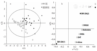 为更好区分SS组及健康组,采用偏最小二乘判别分析(PLS-DA)单独处理两组数据,获得得分图(图3a)和载荷图(图3b),从得分图上可以看出SS组和健康组可以获得完全的区分。分析所采用的数据模型主成分为2,R2Y为0.642,Q2为0.514,交叉验证R2和Q2截距分别为0.032和-0.162。上述参数表明模型没有出现过拟合,结果是可信的。从载荷图上可以看出,所有检测的6种雄激素水平都不同程度地与SS组呈负相关。