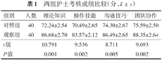 在理论知识、操作技能、沟通技巧与团队协作考核成绩比较上,观察组均高于对照组(P<0.05),见表1。