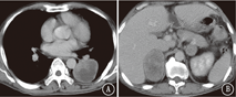 患者男,57岁,于2018年5月2日因"双侧颈部无痛性肿大淋巴结4个月"收入我院。既往吸烟史:吸烟30年,每天60支。入院查体:功能状态评分3分,双侧颈部触及多个肿大淋巴结,部分融合成团,最大直径约5 cm,质地硬,有压痛。左下肺呼吸音低,右侧腹部压痛,深触诊可触及肿物,大小6 cm×5 cm。左侧臀部可触及直径5 cm肿物。血常规:白细胞9.8×109/L,血红蛋白72 g/L,血小板677×109/L。肿瘤标志物:神经元特异性烯醇化酶21.91 ng/ml。肝肾功能及大、小便常规正常。骨髓穿刺活检:细胞形态未见异常,未见癌细胞;粒细胞、红细胞、巨核细胞增生活跃。颈部CT:鼻咽部未见异常,双侧颈部多发大小不等结节,考虑转移淋巴结。胸部CT:左肺下叶圆形软组织占位,边缘较光滑,未见分叶及毛刺,肿瘤大小63 mm×53 mm,内见坏死,增强扫描不均匀强化。纵隔肿大淋巴结,考虑转移。腹部CT:腹腔、双肾上腺肿物。右侧肾上腺明显,大小75 mm×53 mm,左侧肾下极与腰大肌分界不清,见图1。左侧臀部肿物,大小40 mm×51 mm,环周强化。颅脑磁共振成像、全身骨扫描未见异常。于2018年5月14日行左侧臀部切除活检:恶性肿瘤并坏死,免疫组织化学染色示:CKpan(+)、Vimentin(+)、CD3(-)、CD20(-)、CK7(-)、CK20(-)、Villin(-)、CK5/6(-)、P63(-)、NapsinA(-)、甲状腺转录因子-1(-)、Melan-A(-)、Melanoma(-)、CD30(-)、S100(-)、CD31(-)、Fli-1(-),不支持淋巴瘤、恶性黑色素瘤、血管源性肿瘤,不排除肉瘤样癌。2018年5月23日北京大学肿瘤医院会诊意见:支持肉瘤样癌。临床诊断:左肺肉瘤样癌伴颈部、纵隔、腹腔、盆腔淋巴结、双肾上腺、左臀部转移。输血治疗纠正贫血后于2018年6月5日开始口服安罗替尼抗肿瘤治疗(12 mg/d,第1~14天,21 d为1个周期)。2个周期后于2018年7月13日门诊复查颈部、胸、腹部CT:颈部、纵隔淋巴结较前略增大。左肺下叶肿块较前无明显变化,内见空洞。腹腔肿物较前略缩小,内见空洞。右侧肾上腺肿物较前略增大,内见空洞。左侧肾上腺肿物较前略增大,见图2。按照实体瘤疗效评价标准(RECIST)1.1版评价疗效为病情稳定。现继续安罗替尼靶向治疗中。