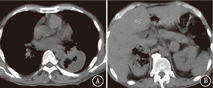 安罗替尼是我国自主研发的新一代抗肿瘤血管生成药物,已经被批准用于晚期NSCLC三线治疗。临床前研究显示,安罗替尼可以通过抑制血管内皮生长因子-A/血管内皮生长因子受体(VEGF-A/VEGFR)、成纤维细胞生长因子/成纤维细胞生长因子受体1(FGF/FGFR1)等多条信号途径抑制肿瘤血管生成,拮抗肿瘤生长和转移,并且比索拉非尼、舒尼替尼具有更强的抑制血管生成作用[12]。患者自2018年6月5日开始口服安罗替尼,2个周期后可见左肺及右肾上腺肿物内坏死、明显空洞形成,腹腔病灶略缩小并有小空洞形成,其余大部分病灶无明显增大,内部坏死较前不同程度增加。根据RECIST 1.1版评价为病情稳定。但根据Choi等[13]的标准,左肺及右肾上腺病灶评价部分缓解,颈部淋巴结、纵隔、腹腔淋巴结评价为病情稳定,总体评价为部分缓解。患者近期的临床获益能否转化为生存期获益,需要进一步观察。