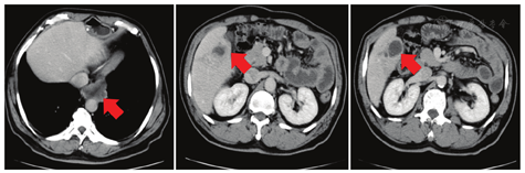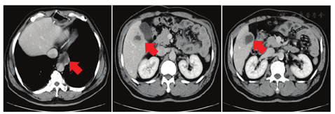 患者男,54岁,喜食腌制品,无吸烟嗜酒史,因"食管鳞状细胞癌术后化疗后5个月,发现肝转移4个月,2周期化疗后进展"于2019年3月4日就诊于中国医学科学院肿瘤医院深圳医院,无肿瘤家族史。患者2018年6月因进食哽咽感行胃镜检查,示距门齿25~31 cm食管近2/3周隆起溃疡型肿物,胸腹部CT未见他处转移,于外院行胸腹腔镜下经右胸/上腹/左颈三切口部分食管切除+胃食管左颈吻合术+双侧喉返神经探查术。术后病理示:食管黏膜下层至外膜层见高至中分化鳞状细胞癌浸润,未见脉管内癌栓及神经束侵犯;左喉返淋巴结见1枚淋巴结转移,胃左旁淋巴结见1枚淋巴结转移,其余淋巴结未见转移。术后分期为pT3N1M0 ⅢB期。