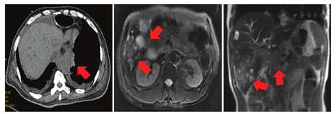 术后ECOG PS评分为1分,因患者拒绝静脉化疗,2018年8月10日至2018年9月21日术后外院行替吉奥60 mg每天早、晚餐后半小时口服,连续口服14 d,每21天为一周期,共化疗2个周期。2018年10月23日复查全身PET-CT示:右侧锁骨上、右侧颈部Ⅳ区、右侧颈部喉返神经旁、降主动脉旁、脾动脉近端近腹腔干多发淋巴结转移,肝S5转移。患者未行治疗。1个月后胸腹盆CT提示降主动脉旁淋巴结转移灶及肝转移灶较前增大(见图1),予紫杉醇脂质体270 mg第1天静脉滴注+顺铂50 mg第1天、40 mg第2~3天静脉滴注,每21天为一周期,共化疗2个周期,2个周期后评价疗效为疾病进展(见图2)。程序性细胞死亡配体1(PD-L1)检测(原手术组织,抗体型号22C3)结果为高表达,肿瘤细胞阳性比例分数(TPS)为80%。2019年2月15日给予帕博利珠单抗注射液200 mg第1天+伊立替康400 mg第2天,每21天为一周期,治疗1个周期。1周后患者出现黄疸,肝功能示:丙氨酸氨基转移酶(ALT)68.6 U/L,总胆红素(TBIL)89.7 μmol/L,直接胆红素(DBIL)83.7 μmol/L。予多烯磷脂酰胆碱注射液等药物治疗后黄疸进一步加重,复查肝功能示:ALT 32.5 U/L,TBIL 235.3 μmol/L,DBIL 215.5 μmol/L;MRI示肝内多发结节部分融合成团,边界不清,肝门部软组织肿物沿胆道系统向肝内蔓延生长,肝内胆管扩张在肝门部截断,胆总管显示不清,考虑转移瘤累及肝门、胆总管。胆囊周围、腹腔及腹膜后、上腔静脉与主动脉间多发结节及肿物,部分融合,大者约6.6 cm×5.1 cm,考虑淋巴结转移。磁共振胰胆管成像(MRCP)示肝内胆管呈"软藤状"扩张,并在肝门部截断,胆总管及胰管显示不清,胆囊显示不清(见图3)。