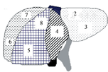 国际儿童肿瘤协会肝脏组(SIOP)于1992年制定,并且重新修订定于2005年[7],根据CT、B超、MRI等影像学检查结果确定肿瘤范围,随着肿瘤累及的象限数逐渐增加,肿瘤分期增加,肝脏从1至4分为4个象限(图1),包括左外叶(第2、3段),左中叶(第4段),右前叶(第5、8段),右后叶(第6、7段)。(表1)