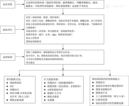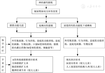 在治疗原发的神经系统疾病,如脊髓脊膜膨出的同时,依据尿动力学分类制定治疗方案。患儿应定期复查尿动力学并进行神经系统评估,以便准确了解膀胱和尿道括约肌功能状态,有效防止上尿路损害。学龄儿童应重视对尿失禁等症状的控制从而改善其社会交往的自卑心理。