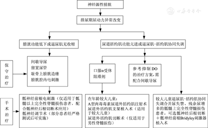 NB的治疗方式首选保守治疗如膀胱或盆底肌训练。生物反馈训练对于上运动神经元损害和部分下运动神经元损害导致的NB有一定疗效。清洁间歇导尿(clean intermittent catheterization,CIC)应在出生后尽早实施,要求孩子的父母从新生儿就开始掌握这项技术。超过50%接受CIC的患儿有菌尿发生,但没有临床症状的患儿不推荐服用抗生素。NB患儿手术治疗没有年龄限制,手术治疗的目的是使膀胱安全储尿和能控制排尿。手术方式分为改善储尿功能、改善排空功能、加强盆底肌和尿流改道等四大类,每种手术方法均有其特定的适应证,应结合个体情况选择手术方式。总之,在保护上尿路的情况下,NB的治疗要确保膀胱排空、容量改善和增加尿道括约肌阻力。