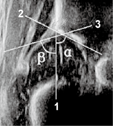 软骨顶线(caterliage roof line):软骨顶线是骨缘与髋臼盂唇中央的连线,即由三角形髋臼盂唇中央向骨缘区内侧缘做一条切线(图2)。有作者称为"扩张线或软骨髋臼盖线" [3,5,12,18],或"髋臼软骨顶线" [19,20]。黄冠兰[11]认为软骨顶线由三角形髋臼盂唇中央与"骨缘转折点"的连线,"骨缘转折点"位于骨缘区上,在这种情况下软骨顶线势必插入骨缘区而不能过骨缘,所得到β角要比实际小。β角对于区分Ⅰa型与Ⅰb型以及Ⅱc型与D型髋关节很重要。