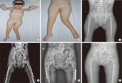 本组8例中,男5例,女3例;初次手术年龄5~39个月,平均16个月。8例合并有双侧先天性马蹄内翻足(congenital clubfoot, CCF),占100%;1例合并双侧先天性垂直距骨(congenital vertical talus, CVT),占12.5%;4例合并单侧膝关节畸形(3例膝关节脱位、1例膝关节过伸),占25%;2例合并双侧腕关节屈曲挛缩畸形,占25%。病例纳入标准符合以下条件:①初次诊断和治疗均在我院,并获得连续随访者;②X线片诊断为双侧髋关节脱位;③出生时至少身体2个不同部位有关节挛缩畸形;④排除进行性神经疾病及其他畸形髋关节脱位者;⑤关节两端变细伴广泛肌肉失用性萎缩;⑥正常关节皮肤皱褶消失(图1、图2)。