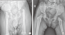所有病例均获随访,随访时间2~5.2年,平均3.5年,其中2例步态基本正常,1例轻微跛行,2例步态不稳,1例需佩戴长腿支具行走,2例不能独立行走。4个髋关节活动基本正常,8个髋关节活动轻度受限,4个髋关节活动明显受限。根据Severin X线片评定标准和修改的McKay临床评定标准,优4髋,良8髋,中4髋,优良率为75%(图3,图4,图5,图6)。
