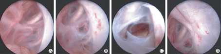 对于囊壁的剥离度是涉及到手术疗效的焦点,过度剥离产生损伤也直接影响愈后。目前多数学者赞同不要求全剥囊壁只要能达到与脑池和蛛网膜下腔充分沟通[6]、术中尽可能减少出血。对于中颅窝底囊肿,内侧中线部位为鞍上池,对此内镜在锁孔技术、液态环境、多角度和深入浅出的手术操作环境下[14]具备优势。本组均采用内镜直视下对鞍上池进行造瘘和开窗,未主动剥离脑表面蛛网膜,术后随访结果显示疗效满意,72.2%患儿在平均10个月达到囊肿消失(图2:术前、术后1年),且89.5%缩小一半以上(其中Ⅱ型为90.8%、Ⅲ型为87.5%)。内镜手术中无开颅术需排尽囊液所造成颅低压之虑,持续平衡液灌流保持颅压相对稳定和视野的清晰。本组患儿囊肿Ⅰ~Ⅲ型,故因颞叶推移程度不一,内镜进入囊内有三种途径,以使进入囊后能直接正对观察到鞍上池。所有患儿鞍上池呈膜状封闭(图2A),根据鞍上池显露血管神经间隙程度选择视神经前后间隙、颈内动脉-动眼神经间隙、动眼神经后间隙进行膜上开窗,用微型剪刀和球囊扩张相结合最大程度将血管神经间隙打开(图2B),电凝收缩飘动囊壁和窗缘。动眼神经-脑干间存在间脑膜者需继续分离和打开(图2C),直至各间隙内清晰见同侧甚至对侧视神经及颈内动脉各分支、动眼神经及基底动脉、脑干等结构。术中如见中颅窝底囊壁随颅压下降和水流冲击后漂浮者需将之切除,以防止出血和飘落囊壁封堵造瘘口(图2D),如囊壁无松动则不主动强求剥离。囊肿破裂者可见壁层塌陷呈不同程度纤维变、增厚及含铁血黄素沉着,可大部分去除。术中开窗时需精细操作和及时球囊压迫出血点,所有病例未出现不可控的出血。4例囊壁病理为室管膜囊肿,分析其影像与蛛网膜囊肿无异,术中发现囊壁较蛛网膜囊肿厚、韧,囊壁上血管分支较多,术中较易出血,操作上尽量避免牵扯。1例患儿囊压极高见动眼神经压至后岩床上,囊壁韧,打开囊壁见动眼神经周围纤维网状粘连,予分离时存在损伤,术后有动眼神经麻痹症状,但2个月后眼裂和眼球恢复正常。