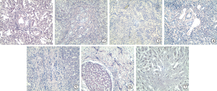 0-3级门管区呈倍数增宽,P-P区增宽显著,界板从清晰、可见逐渐模糊坏死,4-6级门管区、界板消失,肝内主要变化为假小叶形成、增多及间质纤维组织弥漫,炎细胞逐渐减少,纤维细胞从幼稚型转向向成熟型直至形成大量瘢痕(图1,图2,图3,图4,图5,图6,图7)。