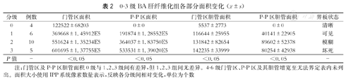 | 分级 | 例数 | 门管区面积 | P-P区面积 | 门管区胆管面积 | P-P区胆管面积 | 界板状态 |