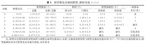 | 分级 | 胆管反应 | 胆管数量(个) | 胆栓(个) | 胆管板畸形(个) | 胆管炎术后(次) | |||