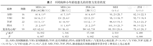 小年龄组中复杂先心组患儿认知低下发生率、智力发育迟缓发生率、运动迟缓发生率均明显高于其他组,室间隔缺损(ventricular septal defect, VSD)组、法乐四联症(tetralogy of Fallot, TOF)组神经认知发育合格率、智力发育迟缓发生率、运动迟缓发生率均明显高于房间隔缺损(atrial septal defect, ASD)组、动脉导管未闭(patent ductus arteriosus,PDA)组,差异均有统计学意义,而VSD组、TOF组组间无差异性;复杂先心组的MDI指数明显低于VSD、PDA组,复杂先心组、TOF组的PDI指数明显低于VSD组,差异均有统计学意义(表2)。大年龄组患儿因66.3%的病种为VSD,其他病种病例数较少,故未做分析。