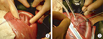 MOMS宫腔内修复术,麻醉方式采用肌内注射麻醉剂和肌肉松弛剂的混合物,经腹子宫切开,结合超声探查胎盘位置选择切口[21]。开腹后将胎儿MMC病损部位暴露于子宫切口处,术中应用超声监测确保胎心的正常,宫内手术与生后脊髓脊膜膨出修复过程相似[23,24,25]。先于病损周围囊壁薄无神经纤维粘附处切开,若粘连囊壁的神经纤维需谨慎剥离,进入包绕着神经基板的蜘蛛膜,将残留上皮组织从神经基板切除[26]。研究表明残留上皮组织可能会增加表皮样包涵囊肿形成,囊内除了结缔组织纤维可切断,所有的条索状物均需针麻仪探测是否为膨出神经组织,均予以保留,将剥离的神经组织送回椎管,生物膜覆盖其上,可能起到屏障与避免脊髓拴系的作用,但目前未经证实,硬脑膜覆盖严密缝合,在多数病例中硬脑膜层不足无法缝合覆盖,可用硬脑膜修补材料替代(DuraGen)(图1, 图2)[21,27]。